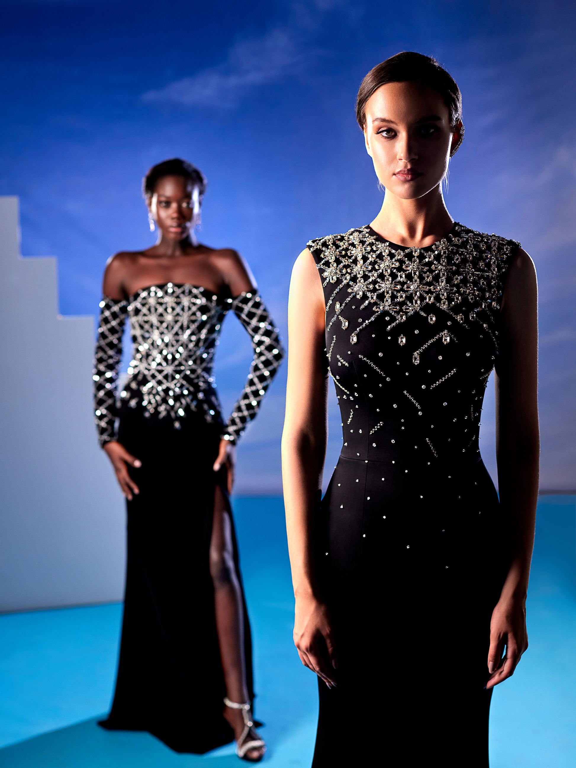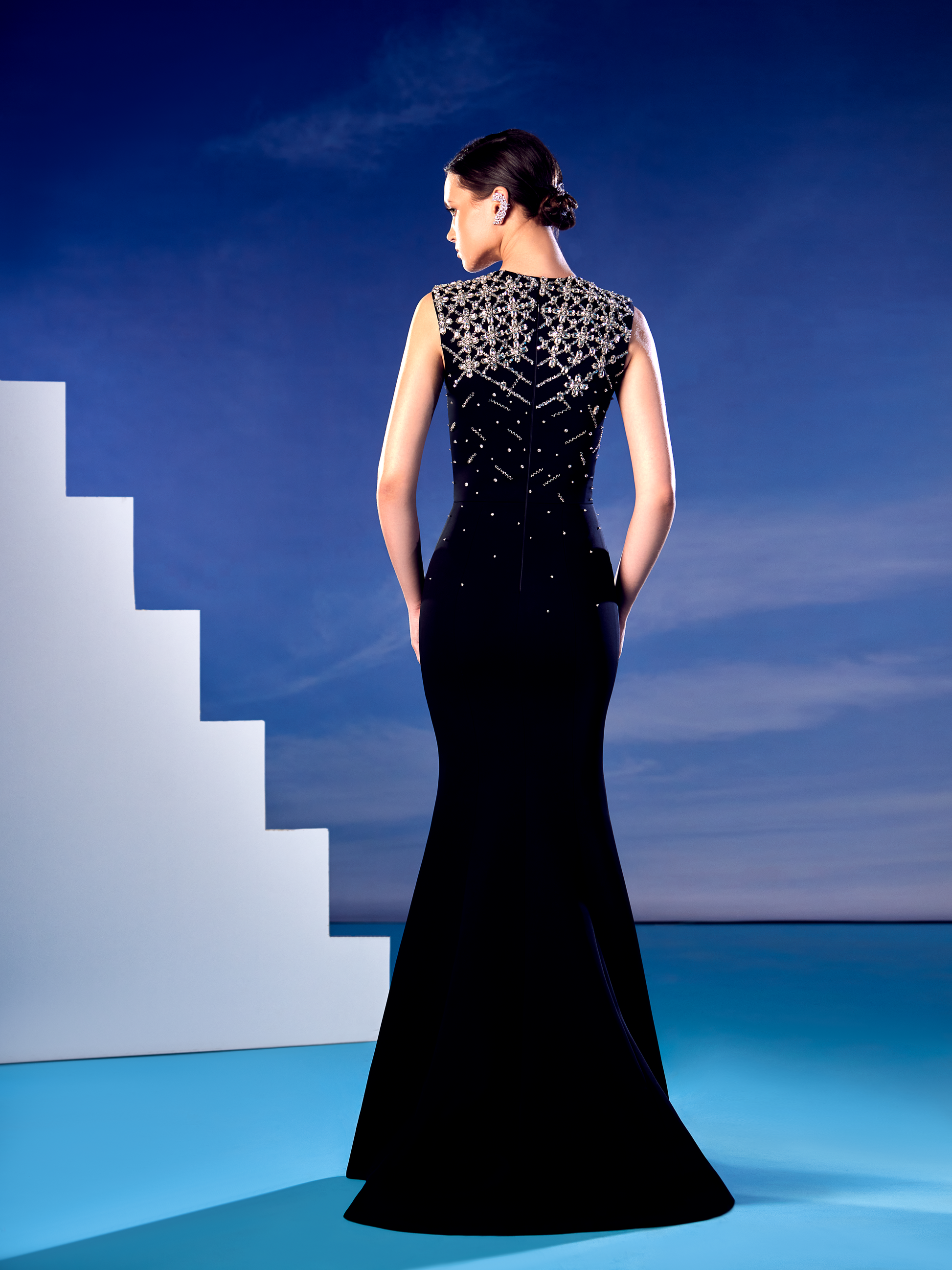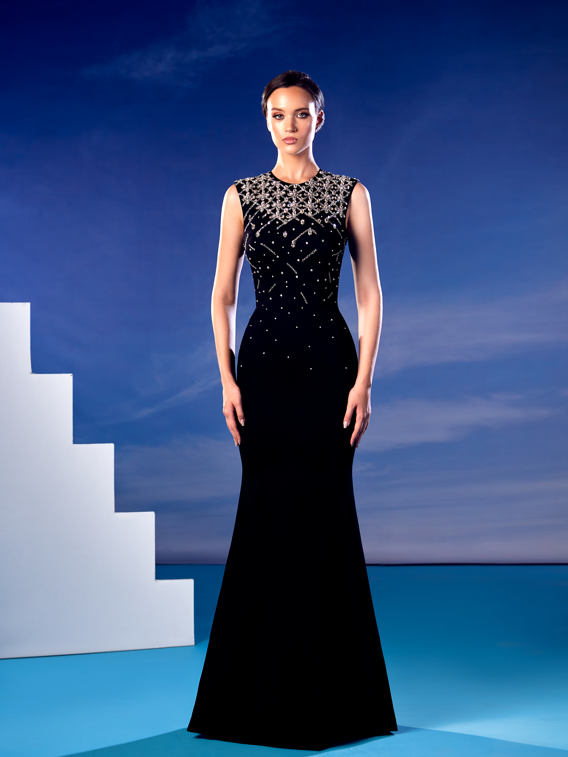 Hand embellished black dress Moroccan crepe with geometric embellishement of crystals and Swarovski.