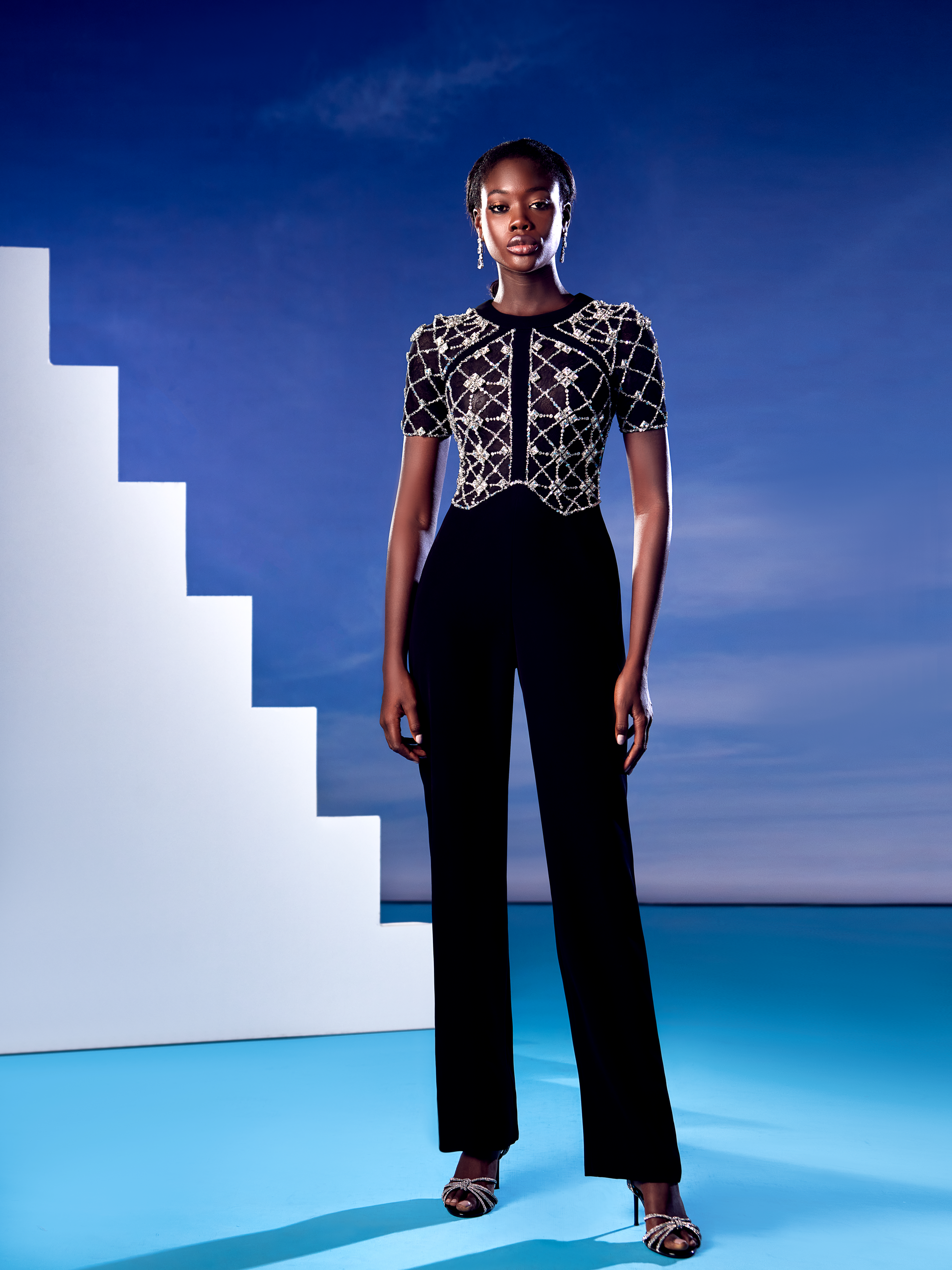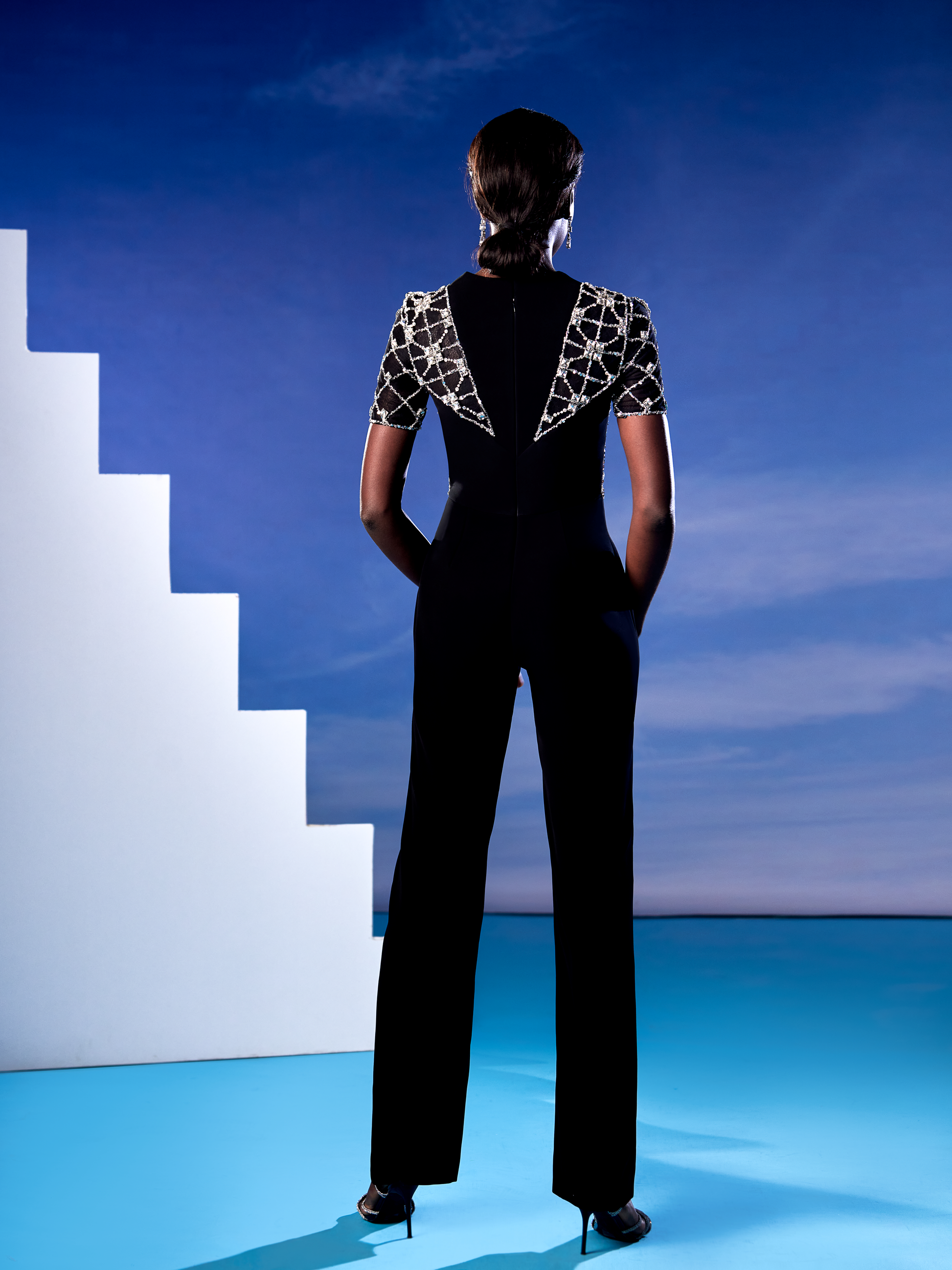 Jumper in black Morrocan Crepe with geometric Swarovski embellishment.