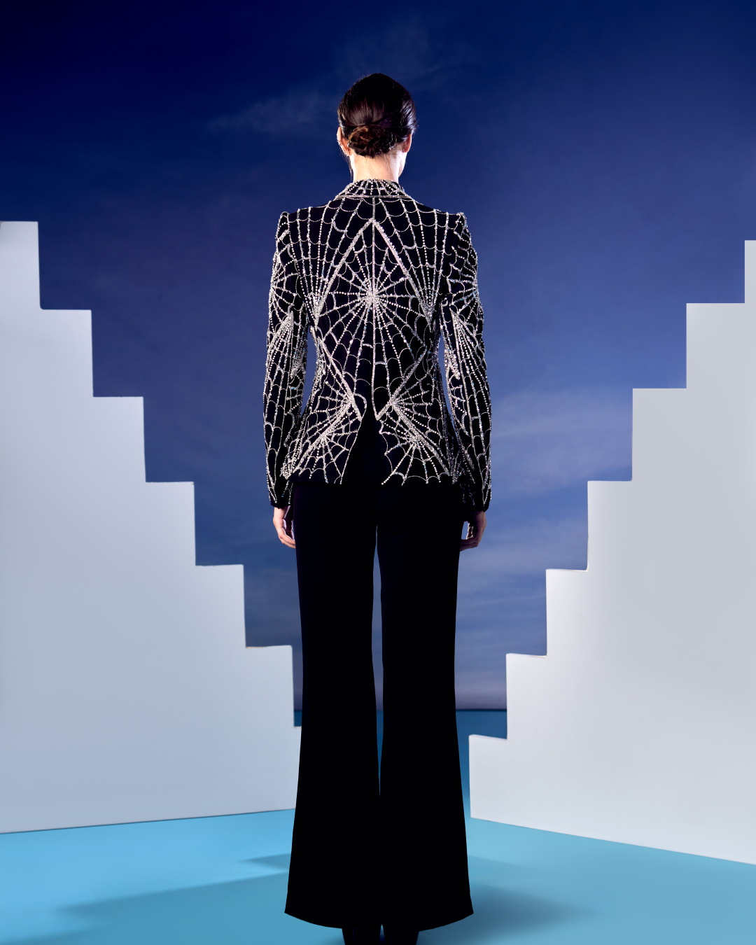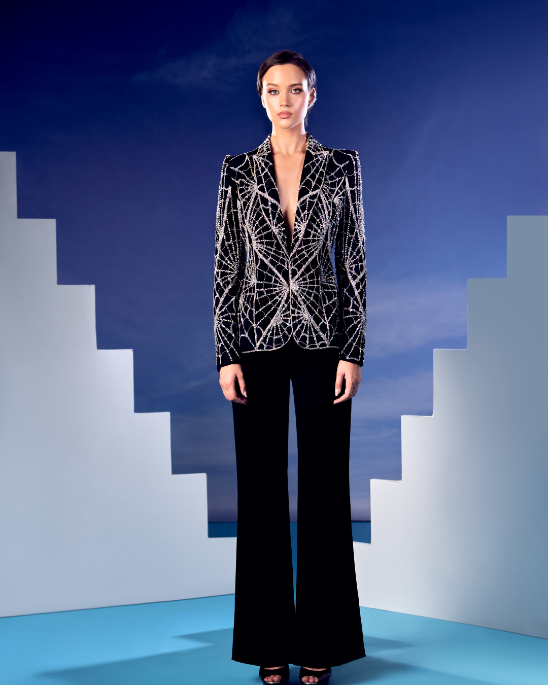 jacket and pants embellished with geometric embellishement of crystals and Swarovski.