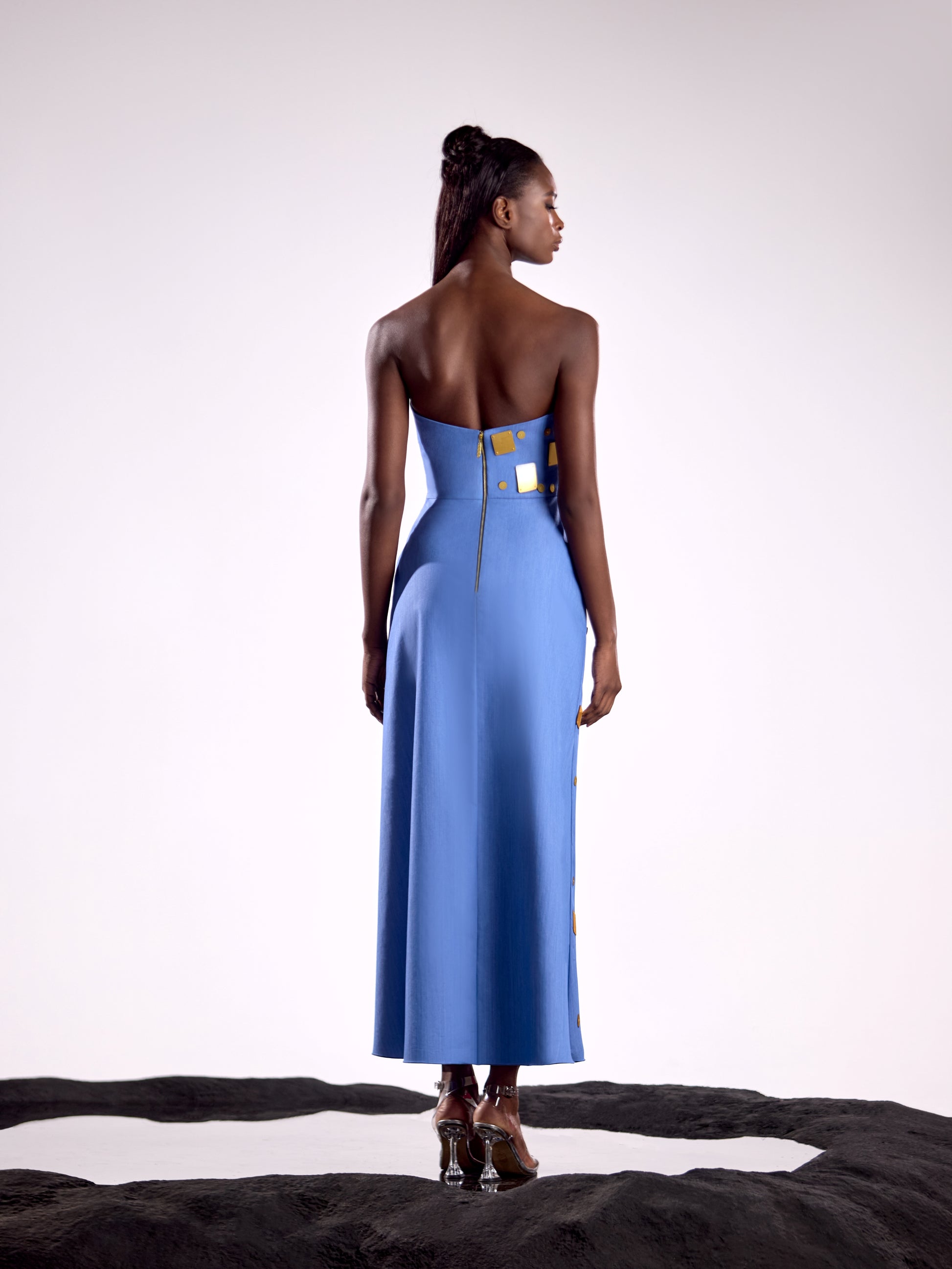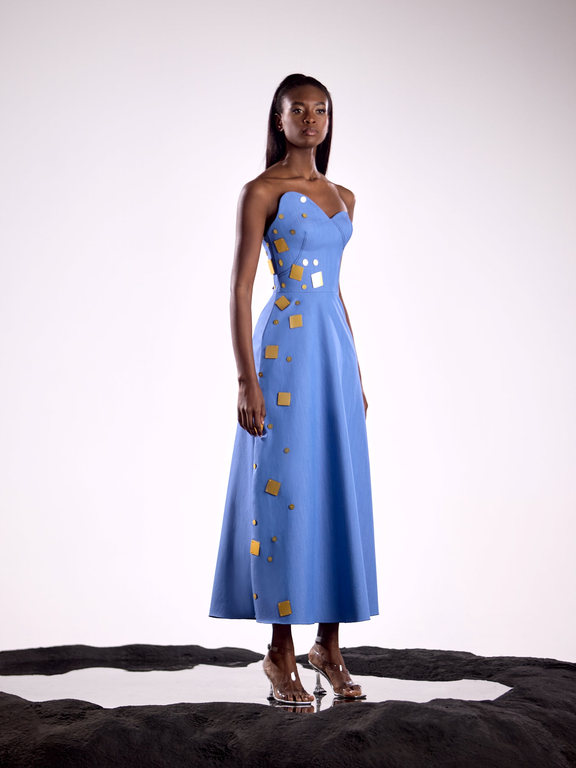 This strapless denim dress is embellished with eye-catching paillettes and accessories, making it perfect for any special occasion. With a flattering fit and stylish design, it will surely turn heads. Made with quality denim, it offers both style and comfort. Elevate your outfit with this must-have dress.