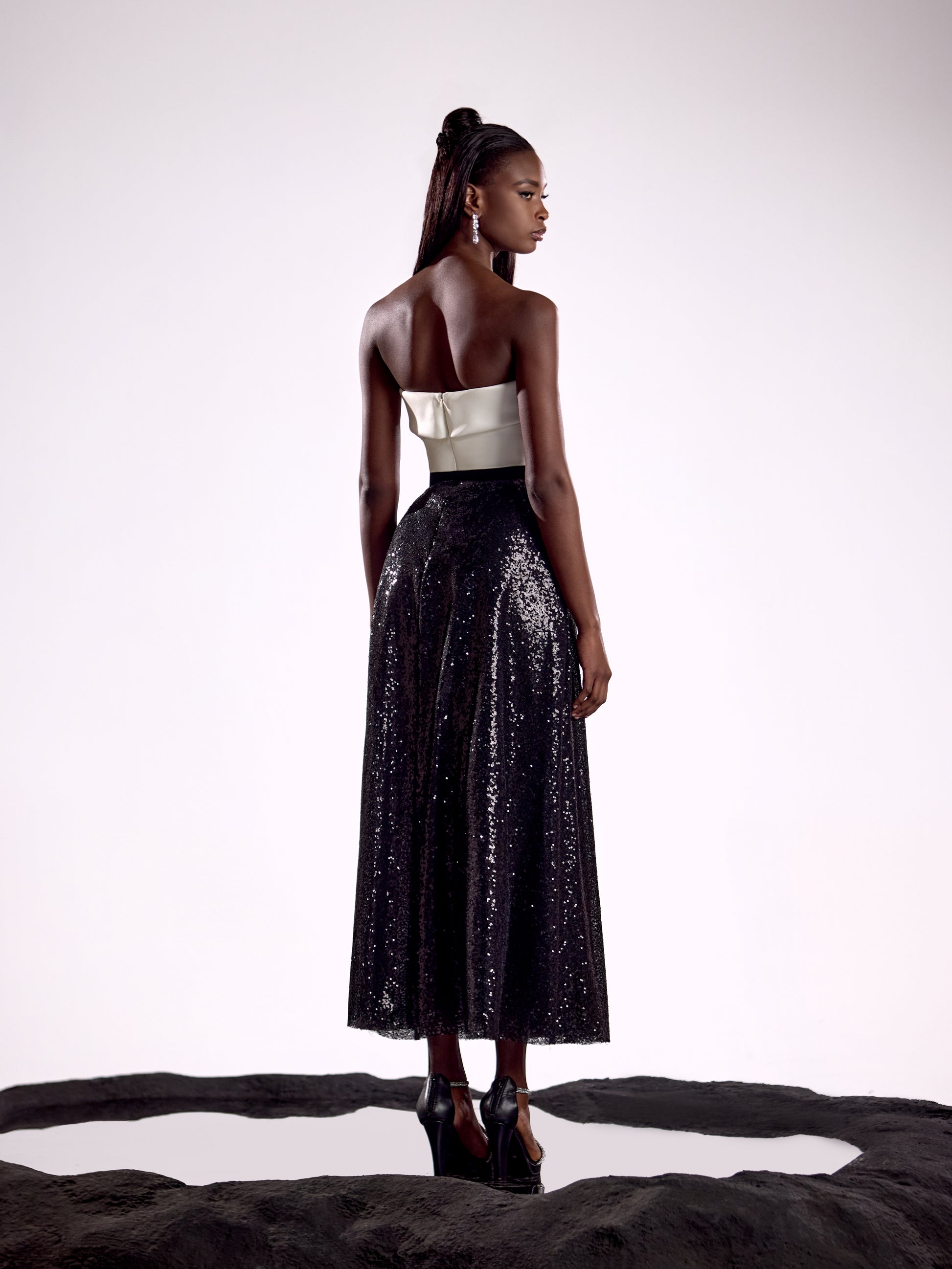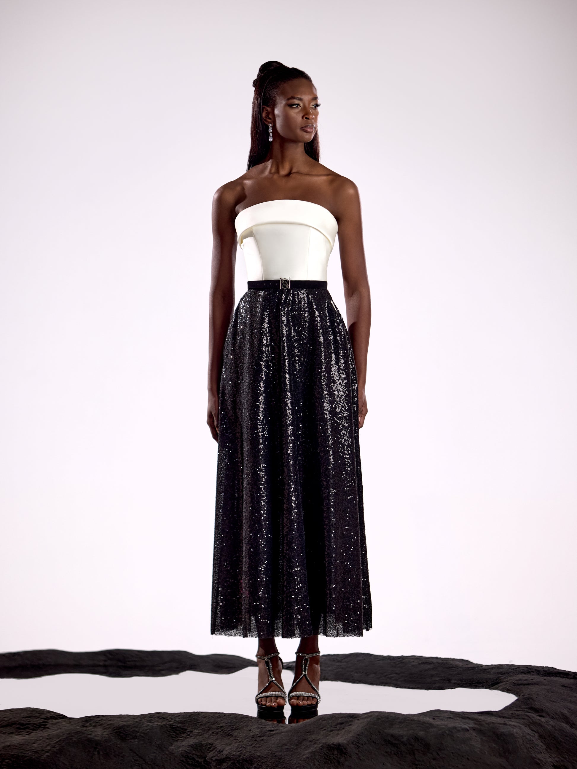 Elevate your formal wear with Centaurée, crafted with a Mikado bodice and Tulle couture skirt adorned with paiellettes. This elegant combination offers a regal touch while exuding sophistication. Impress with the top-of-the-line materials and intricate embellishments of Centaurée.