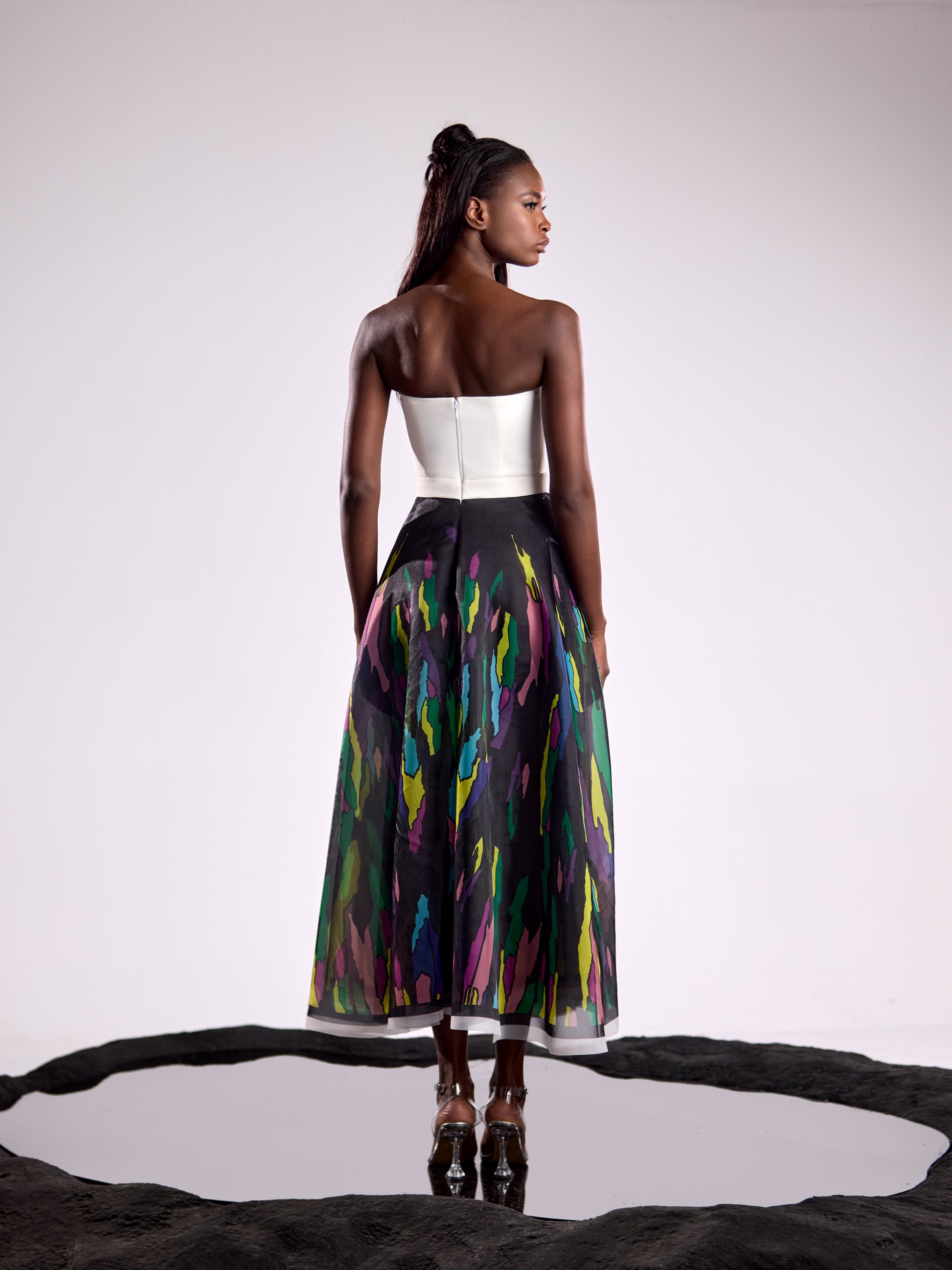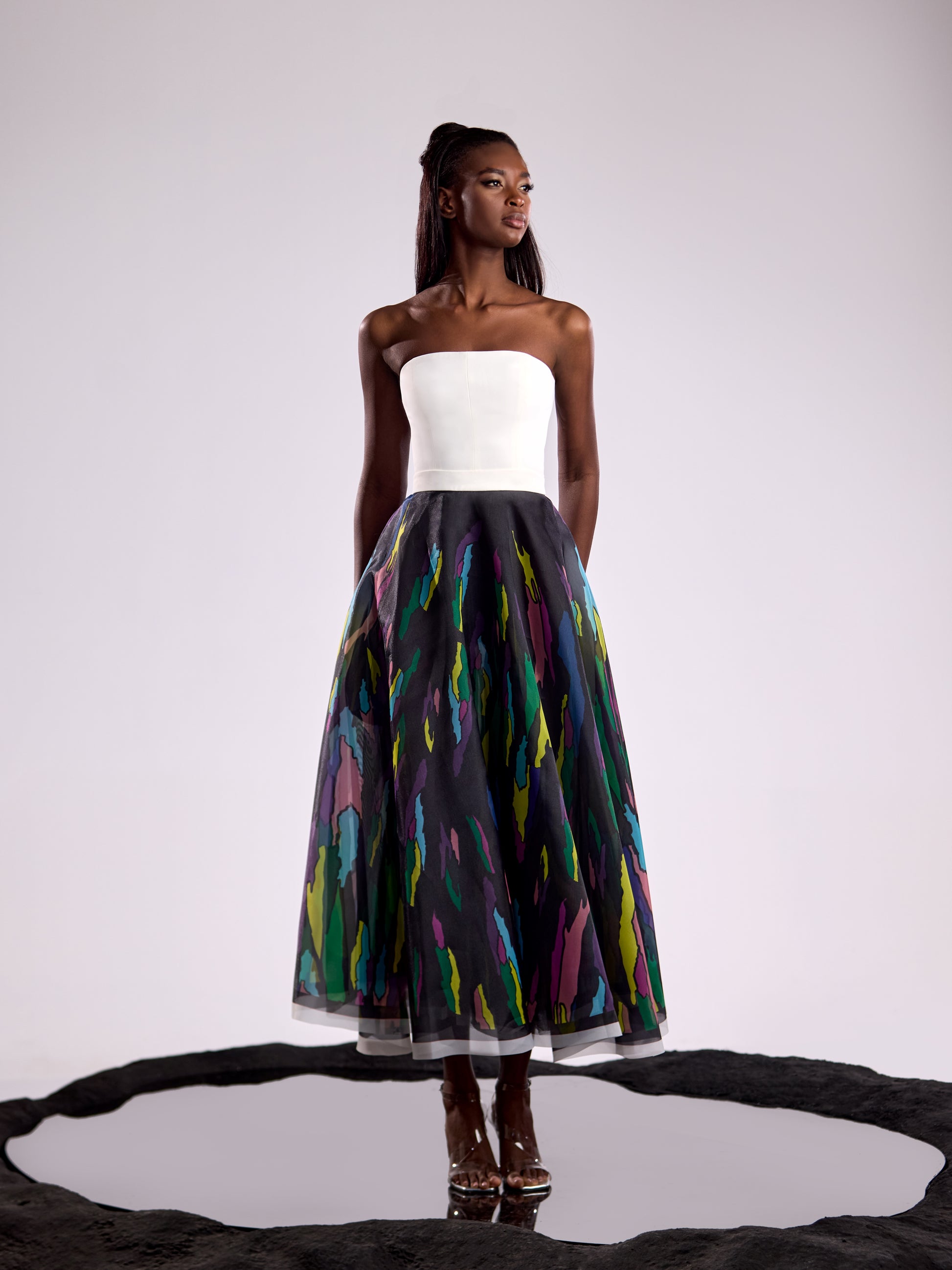 Expertly crafted from a blend of crepe and organza, our Sprinkle-of-Colors dress offers a sleek, strapless silhouette. The lightweight fabrics provide comfort and breathability, making it perfect for any formal occasion. With its elegant design, this dress is sure to make you stand out in any event.