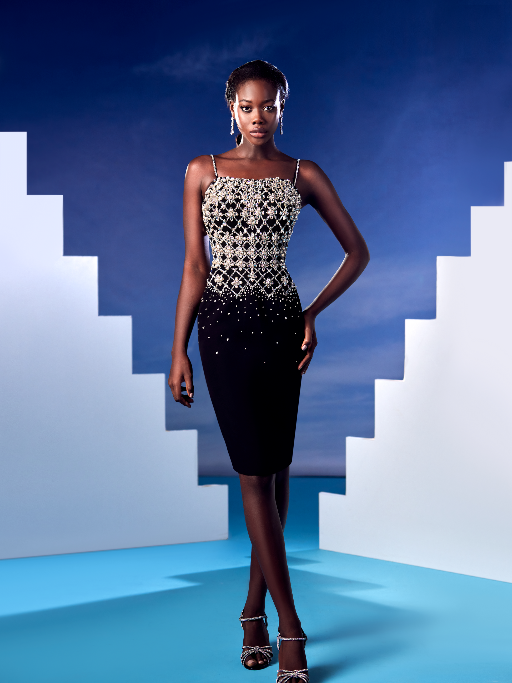 Black strapless dress with geometric embellishement of crystals and Swarovski. The cinched waist enhances the A-line pleated silhouette, while a bow embellishes the sweetheart neckline.