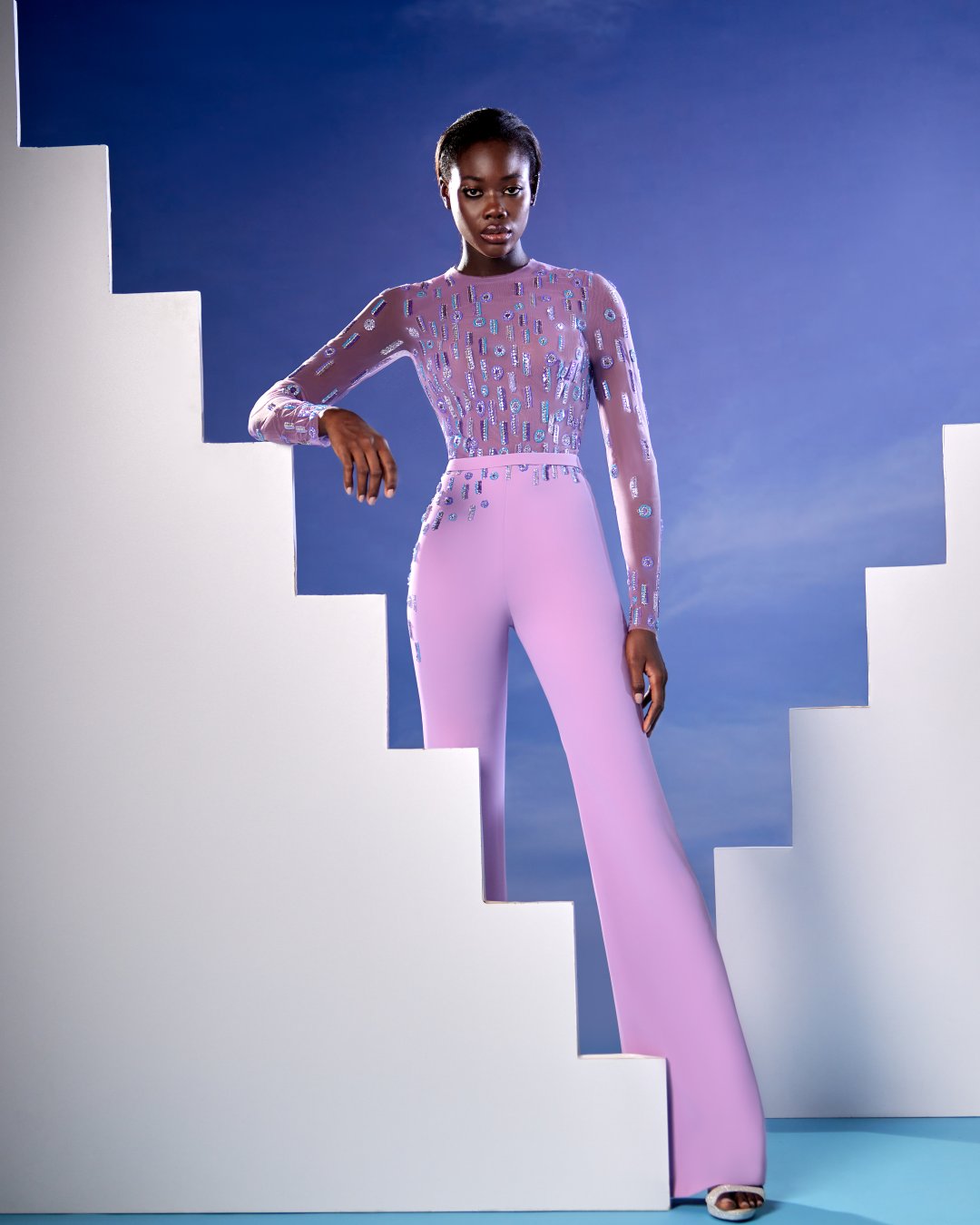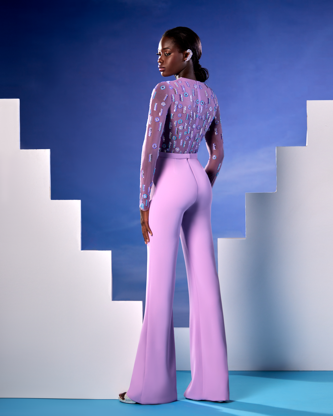 Long Sleeves, purple jumpsuit with embellished with geometric Swarovski embellishment.