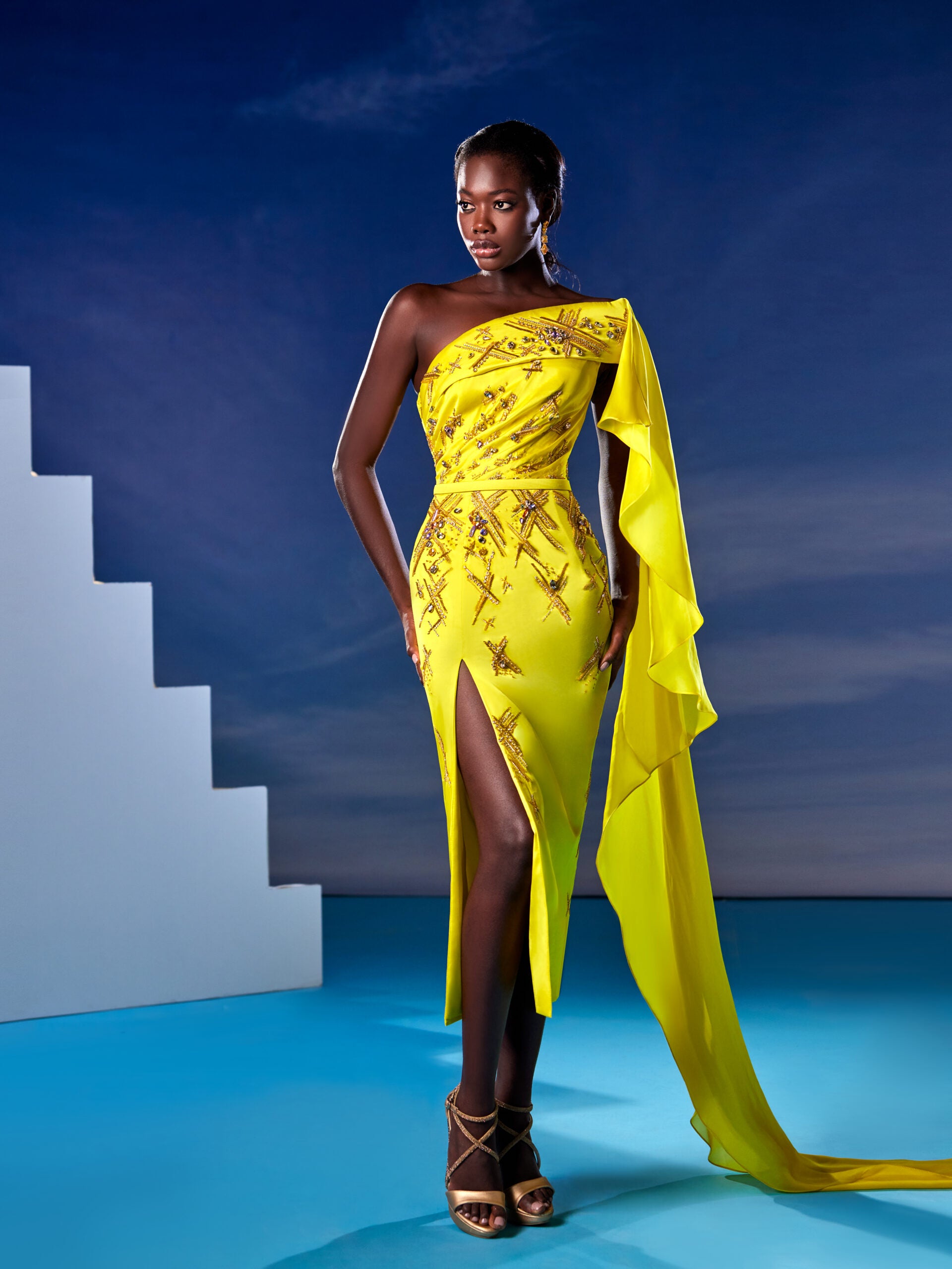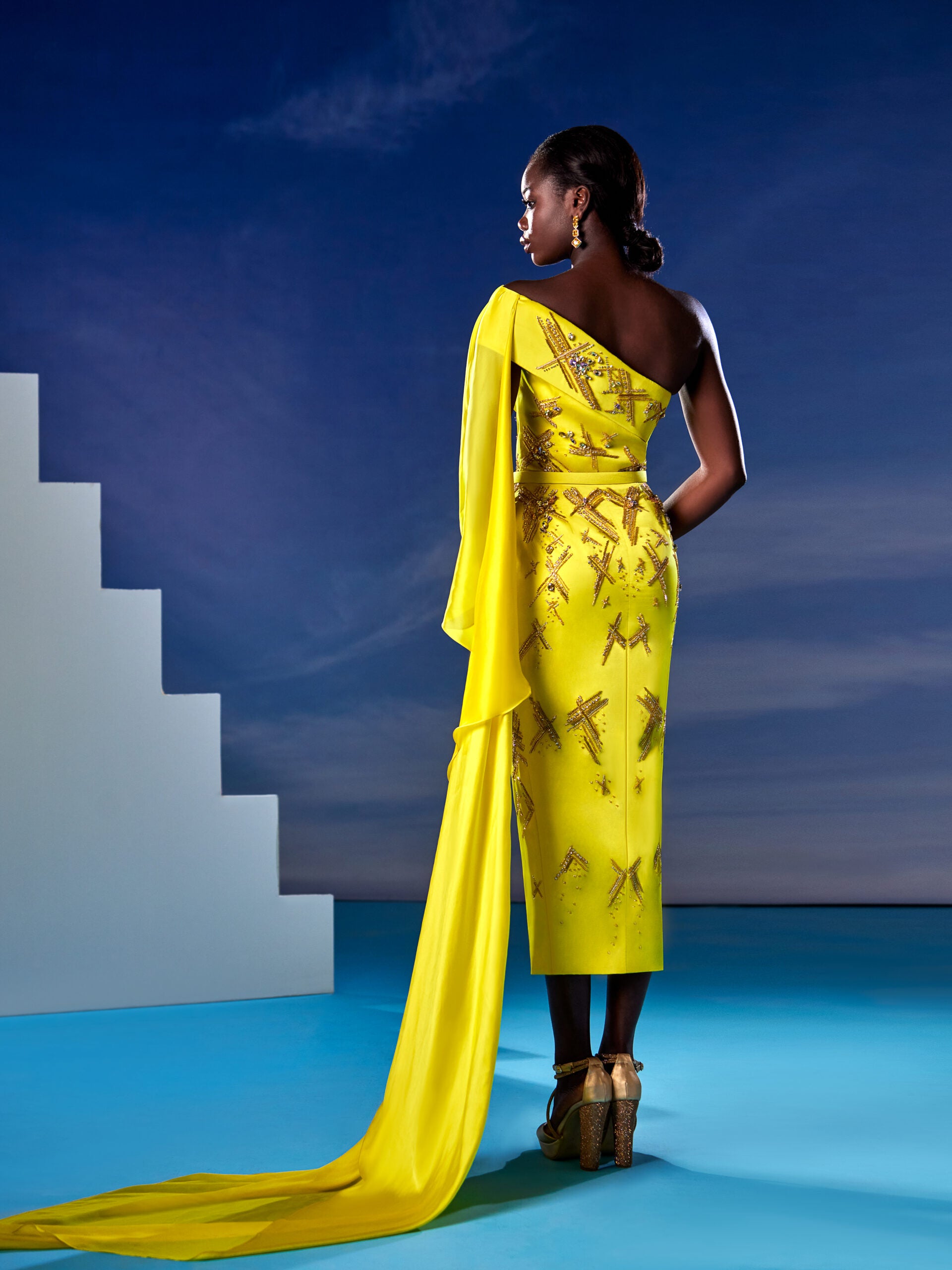 Yellow off shoulder Ramiro dress with hand embellishment and shoulder cape that could cover head.