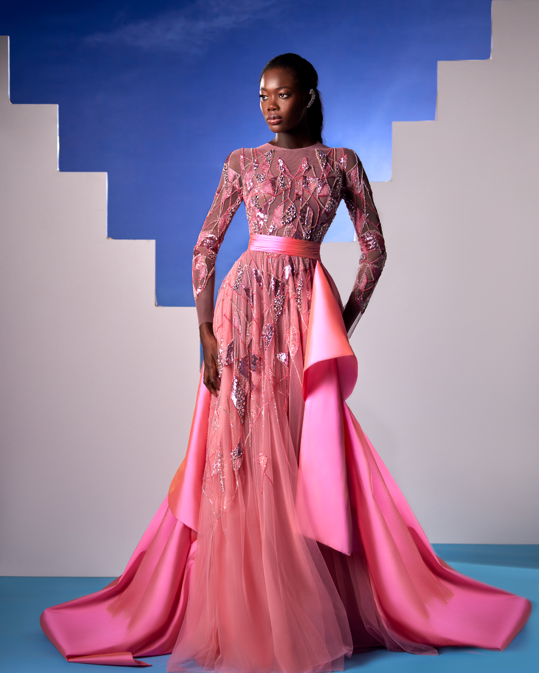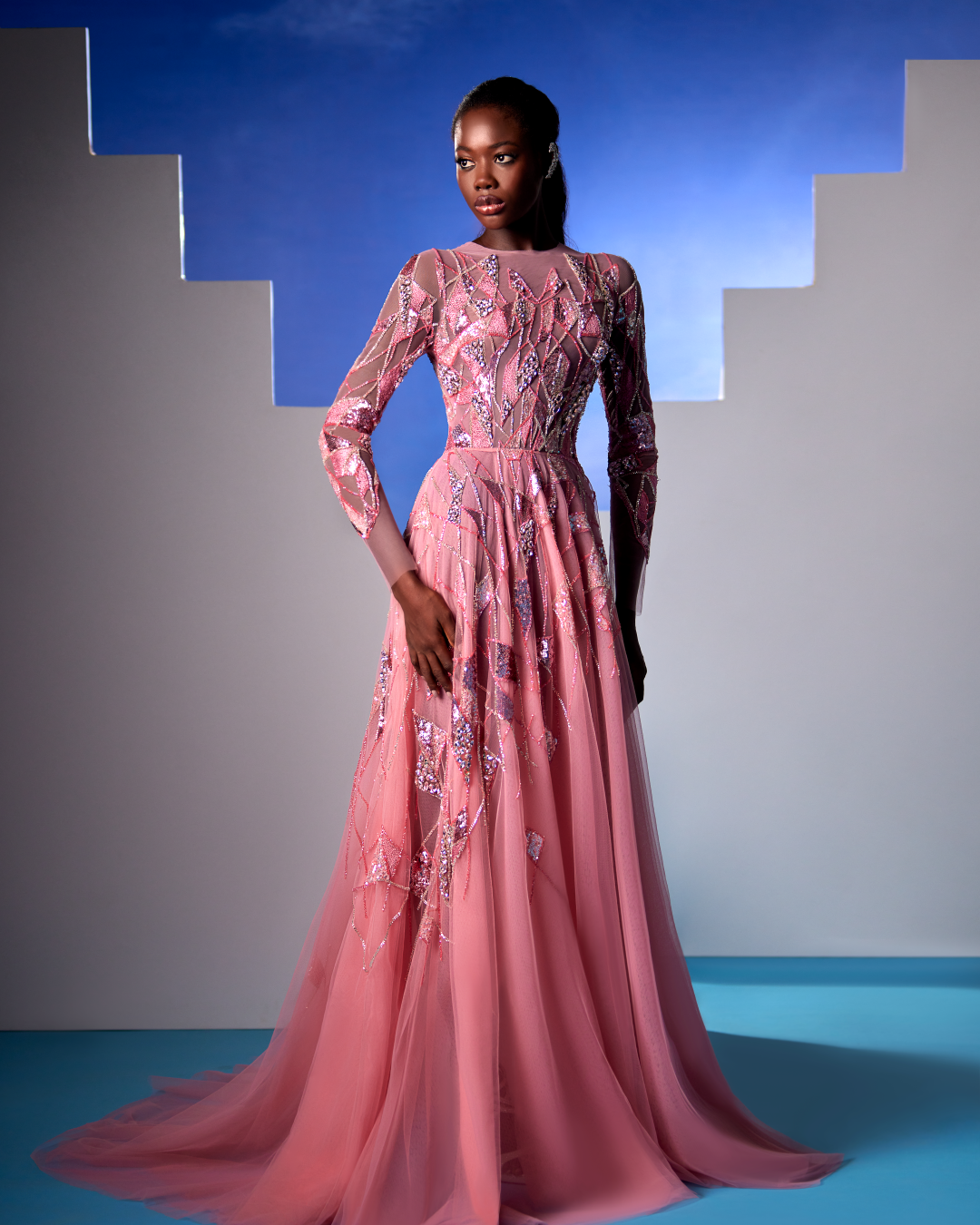 Hand and bust embellished Pink dress with geometric embellishement of crystals and Swarovski.