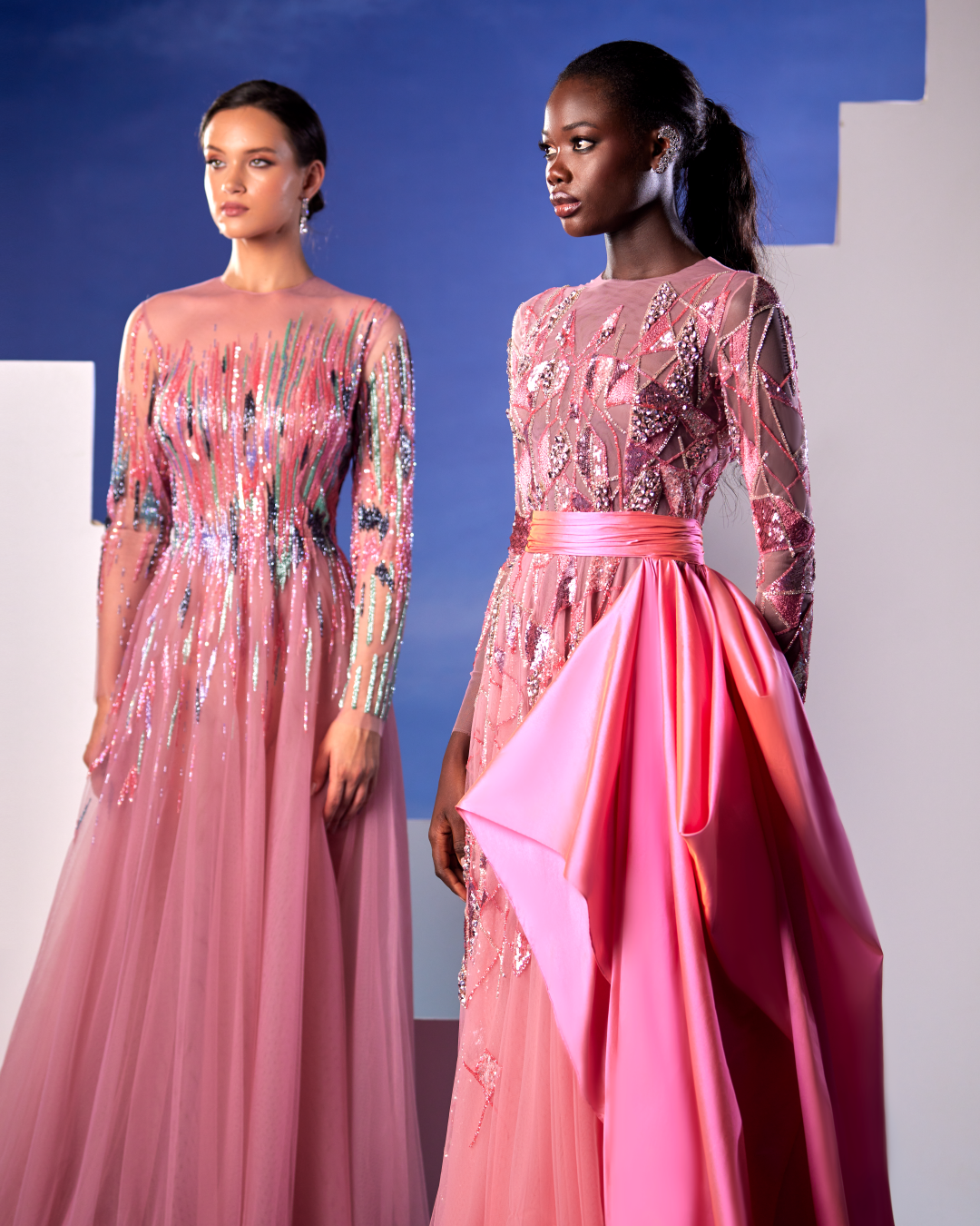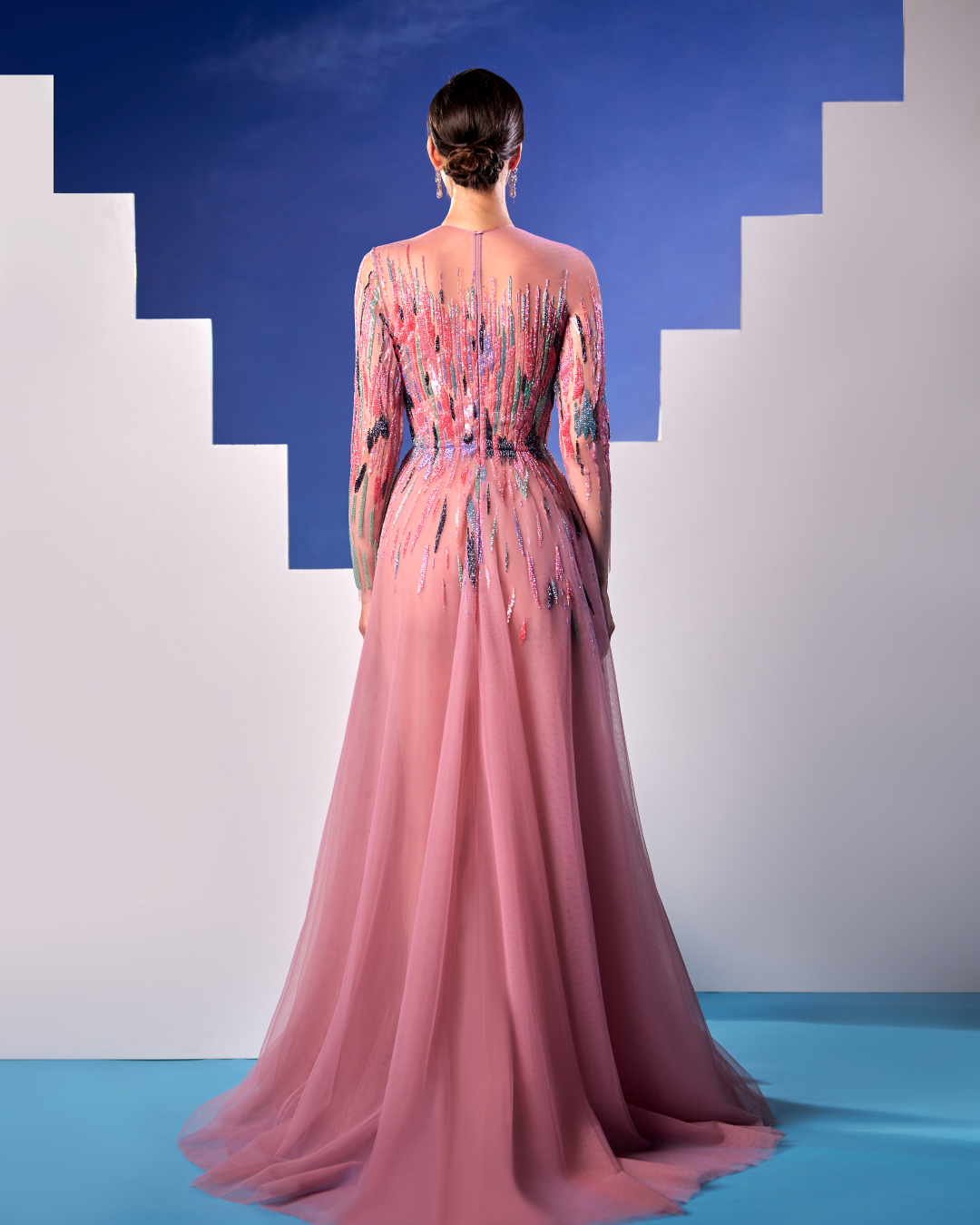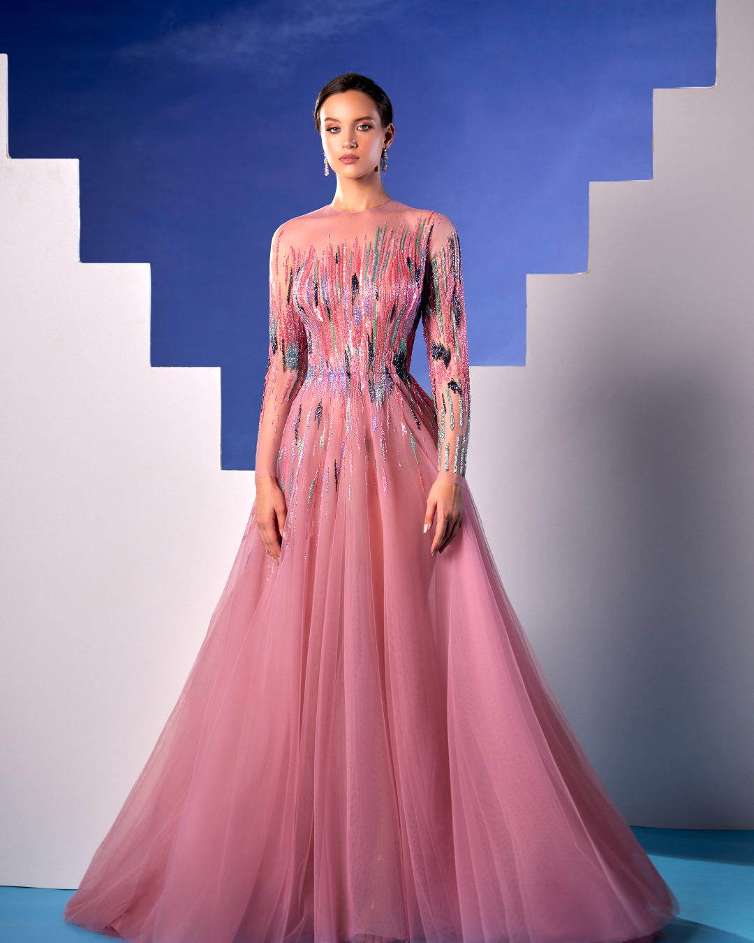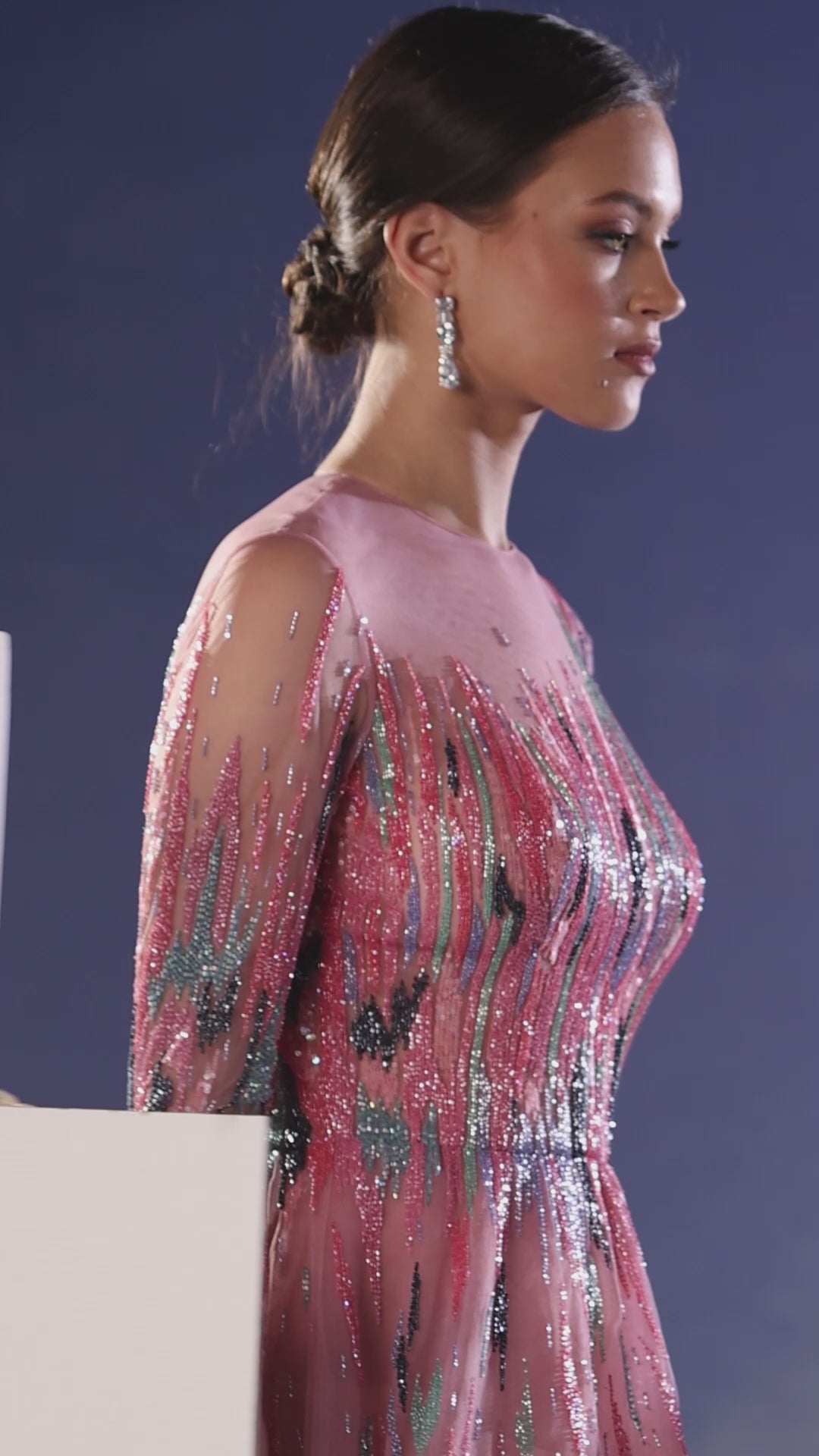 Hand and bust embellished Pink dress with geometric embellishement of crystals and Swarovski.